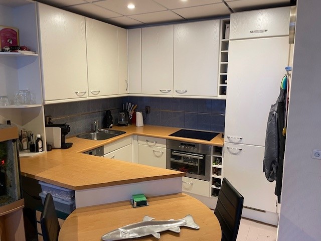 Voordeur, kleine hal, open keuken met eetgedeelte en inbouwapparatuur, woonkamer, aparte slaapkamer, badkamer met douche, toilet, wastafel, kast met opstelplaats van de wasmachine en de warm water boiler.