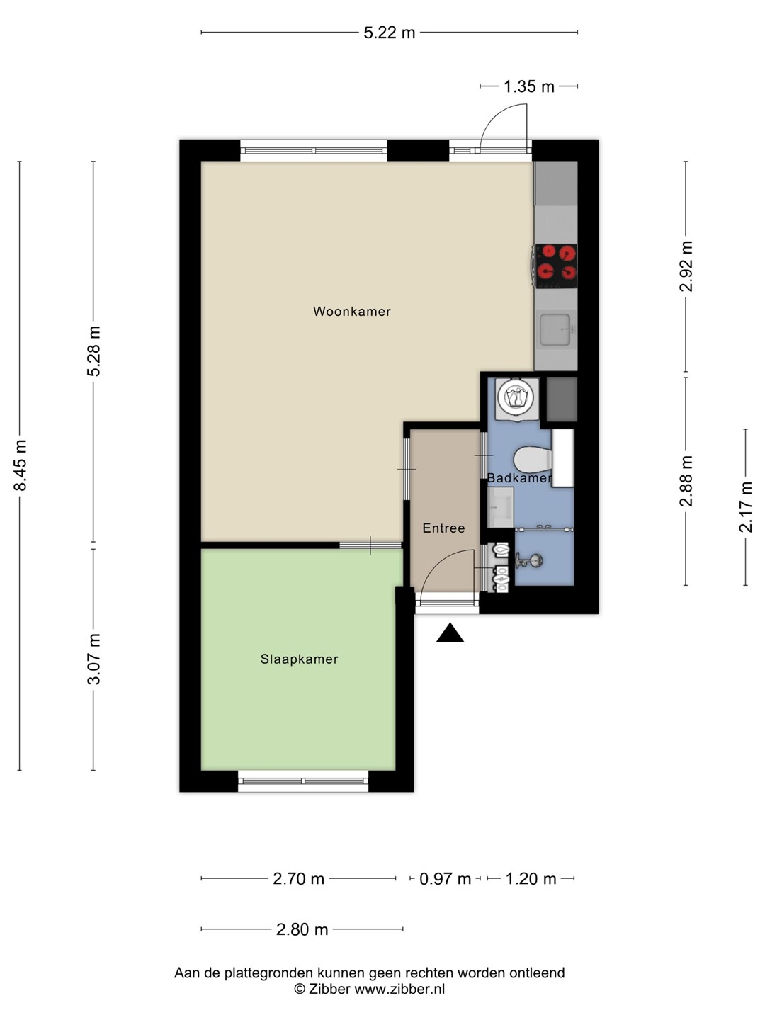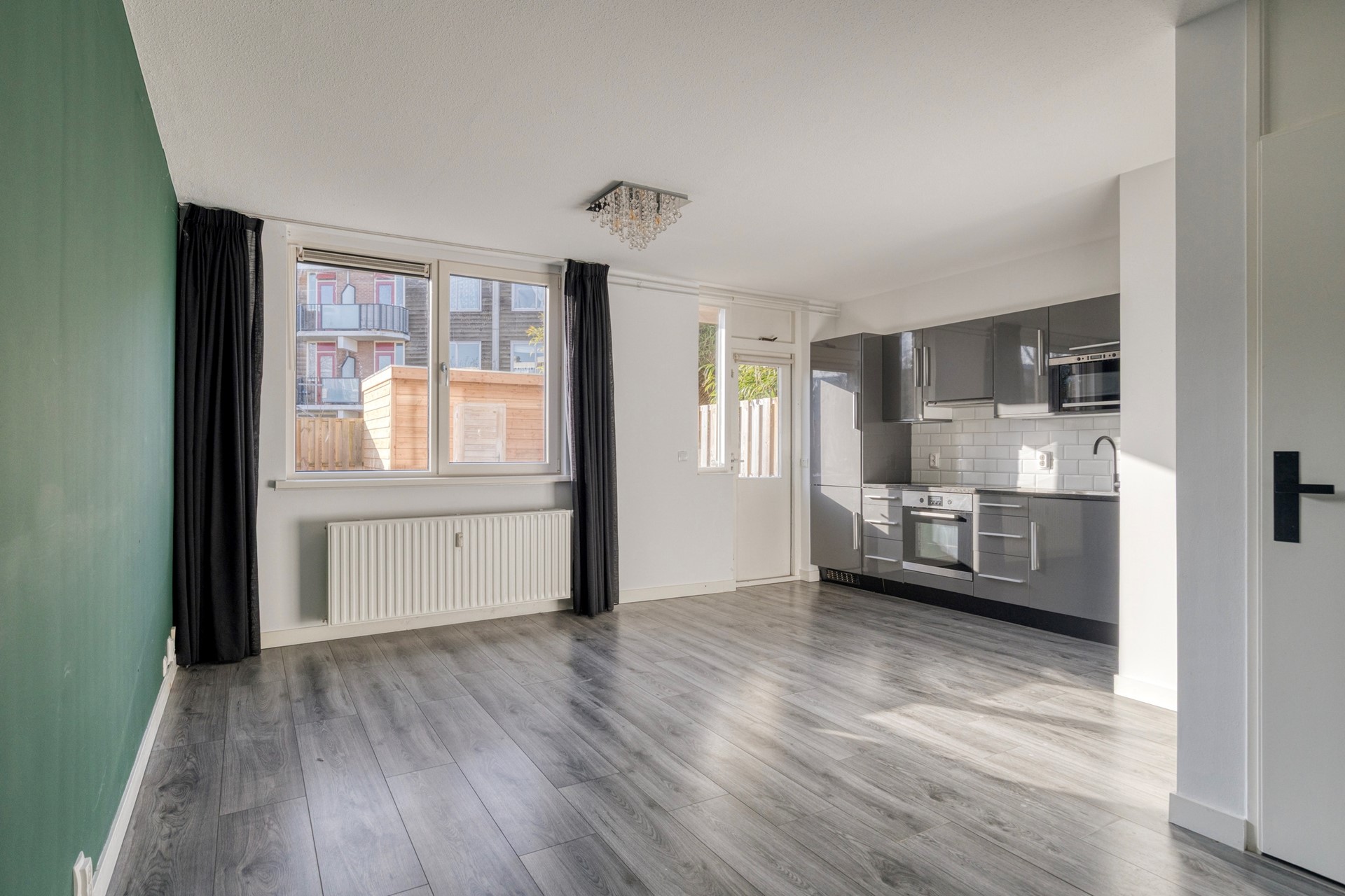 voorkamer is de slaapkamer en gezellige woonkamer met moderne open keuken, voorzien van inbouwapparatuur en deur naar de achtertuin