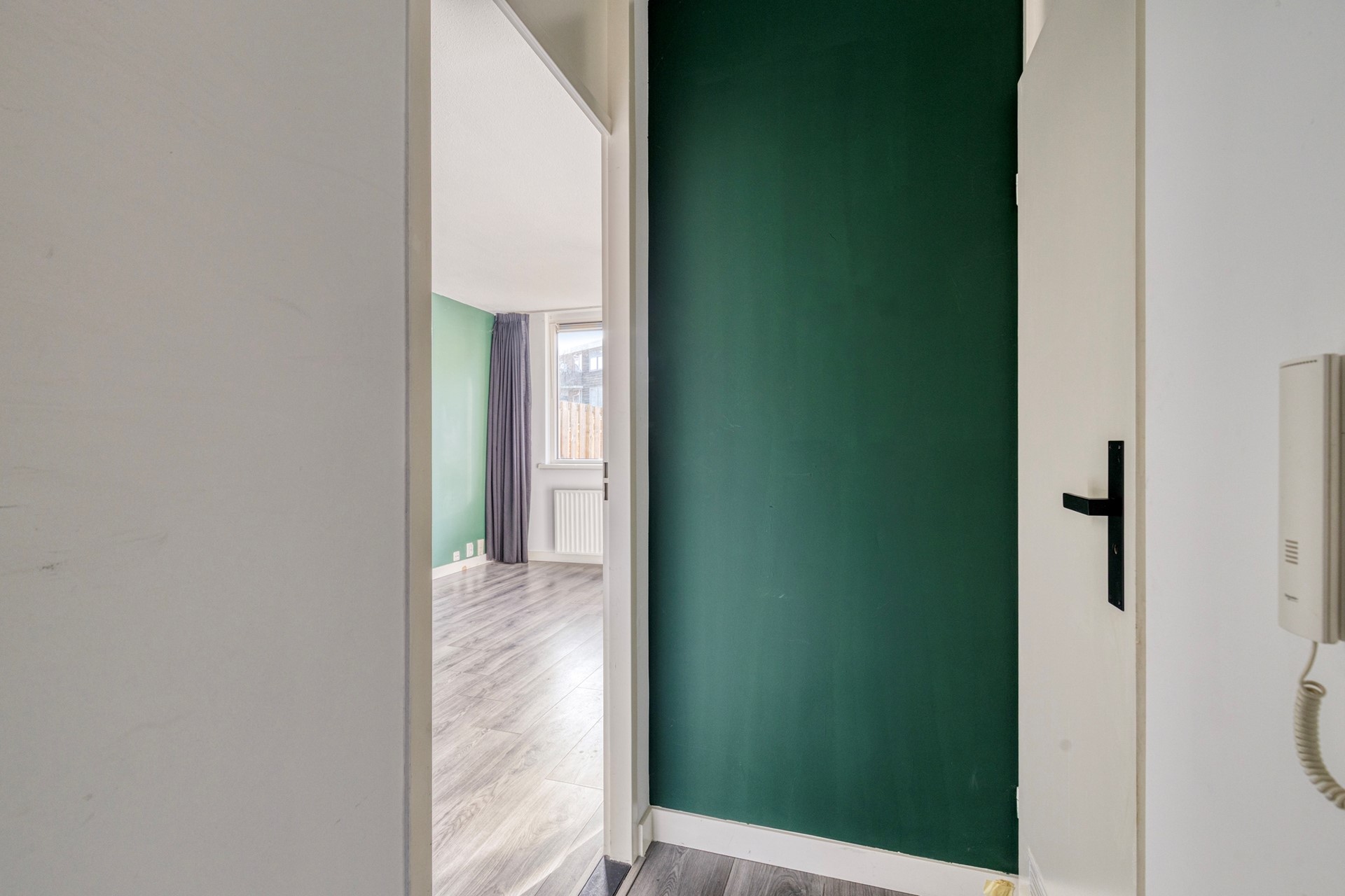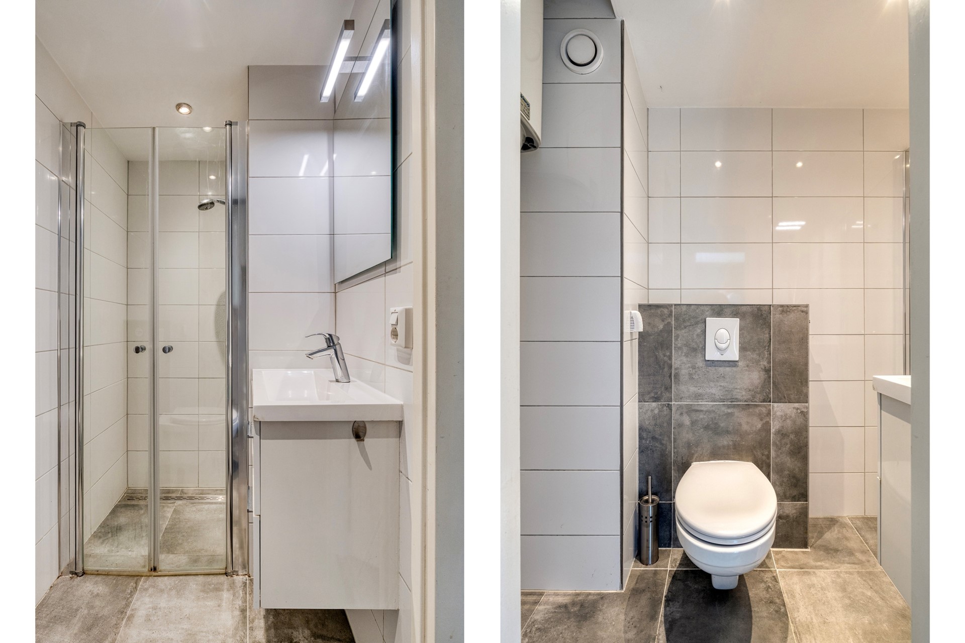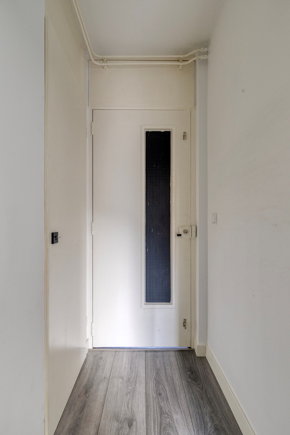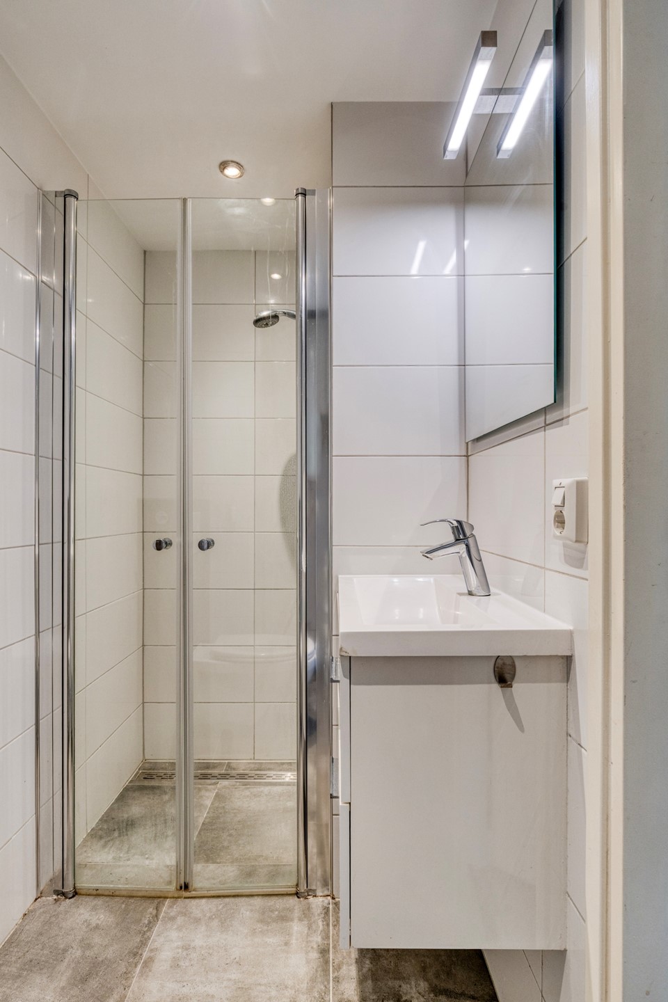 Via afgesloten portiek met brievenbussen en intercom, naar de voordeur, compacte hal met meterkast (voorzien van voldoende groepen en glasvezel aansluiting), moderne badkamer met douche voorzien van glazen deur, wastafel met meubel, toilet en wasmachine aansluiting.
