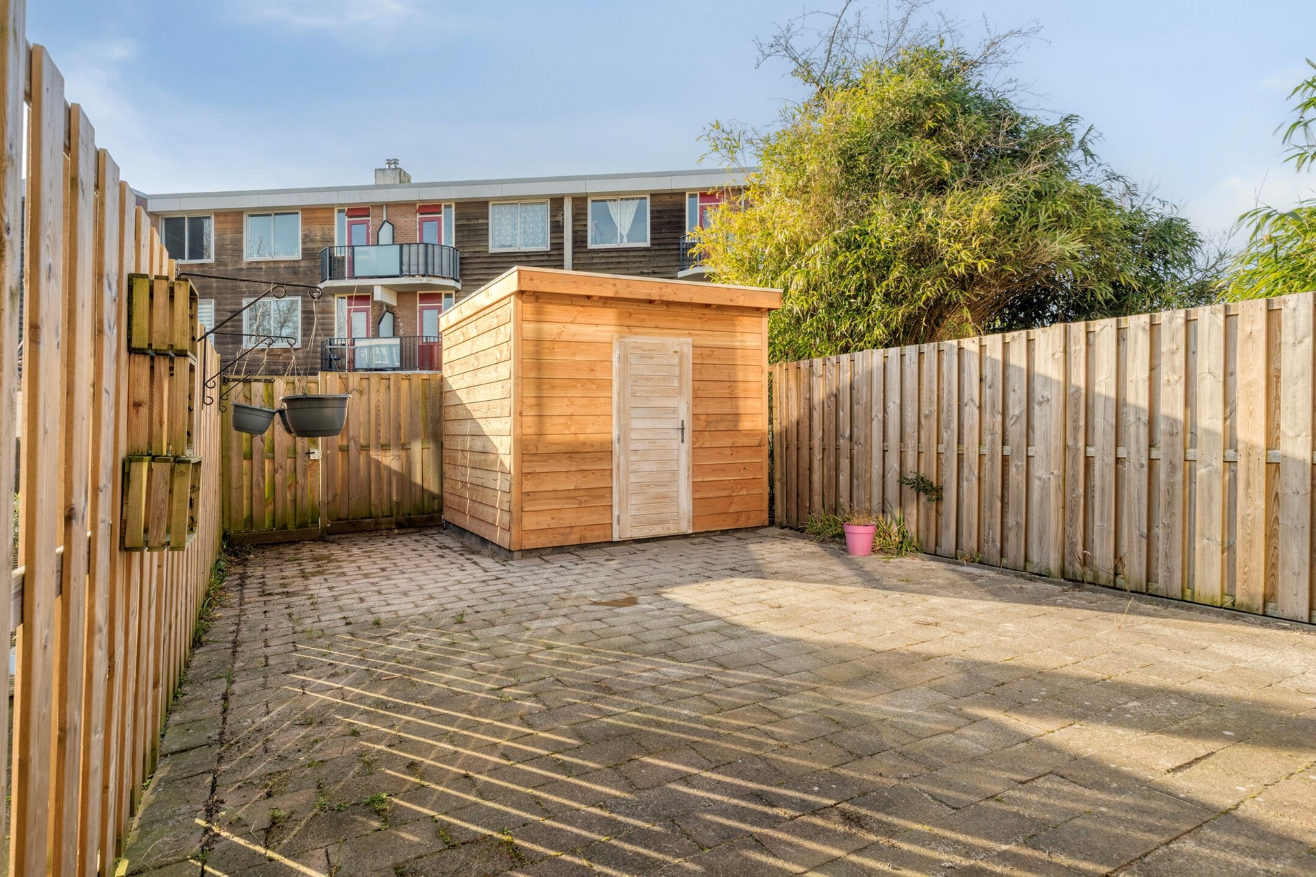 De achtertuin is 10 meter diep en 5 meter breed voorzien van een achterom en een nieuwe blokhut met elektra.