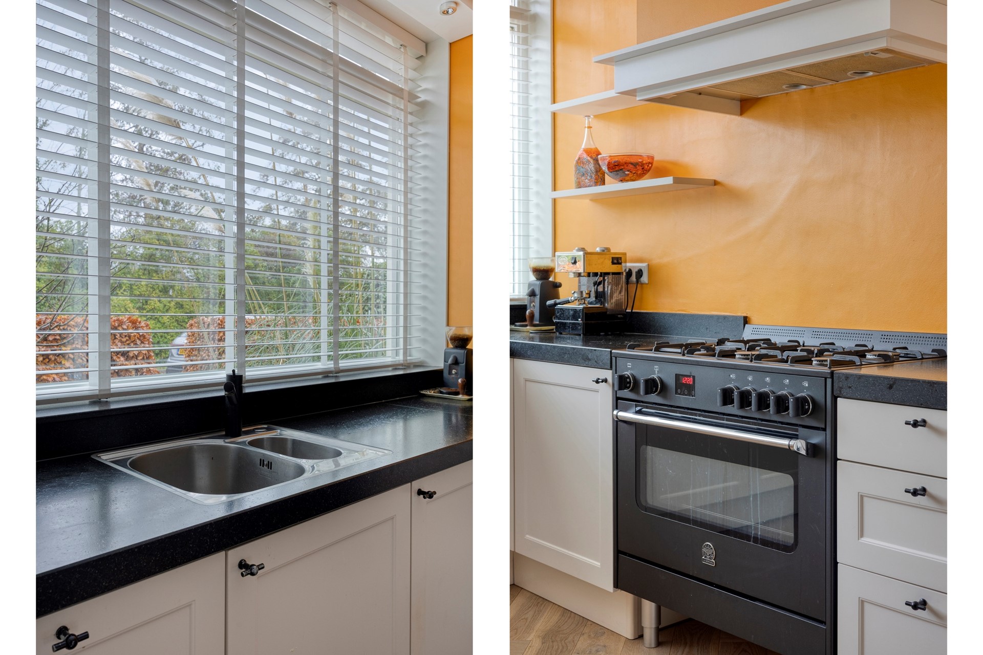 Indeling: entree met meterkast, trapopgang en toiletruimte met wandcloset. Tuingerichte woonkamer met trapkast en aan de voorzijde een woon-/eetkeuken. De keuken is voorzien van een luxe 90 cm brede gasfornuis/oven-combinatie met afzuigschouw, elektrische oven/magnetron combinatie, aparte ruime koelkast en vriezer, close-in boiler en vaatwasmachine. Via de openslaande deuren bereikt u de groene achtertuin met ruime terrassen en achterom. De tuin heeft een gunstige zonligging op het noordwesten en is bijna 12 meter diep en 6 meter breed. Hier bevindt zich ook een houten berging (6 m²) met elektra.