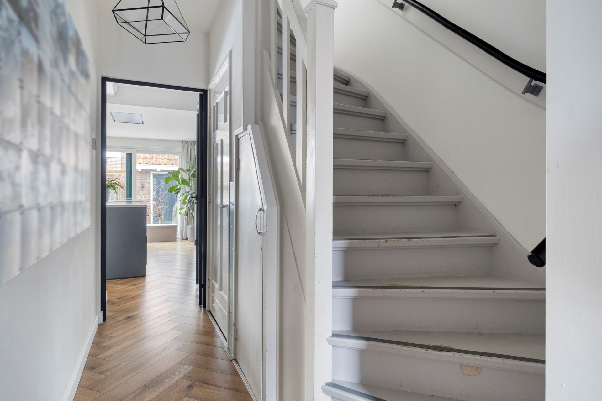 Voortuin, entree woning, hal met (nieuwe) meterkast, trap naar bovengelegen verdieping. Ruime trapkast, toilet, deur naar de lichte woonkamer, doorloop naar de keuken (die voorzien is van diverse inbouwapparatuur). Vanuit de woonkamer eveneens een doorloop naar de voorkamer. Via openslaande deuren die toegang biedt bereikt u de fijne zonnige achtertuin op het zuidoosten. In de tuin is ruime schuur aanwezig.
