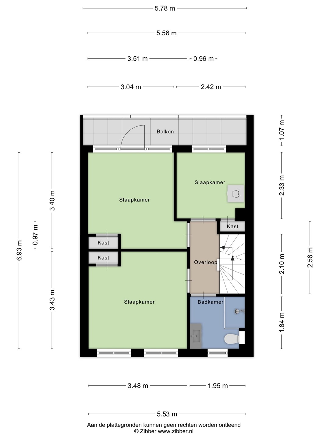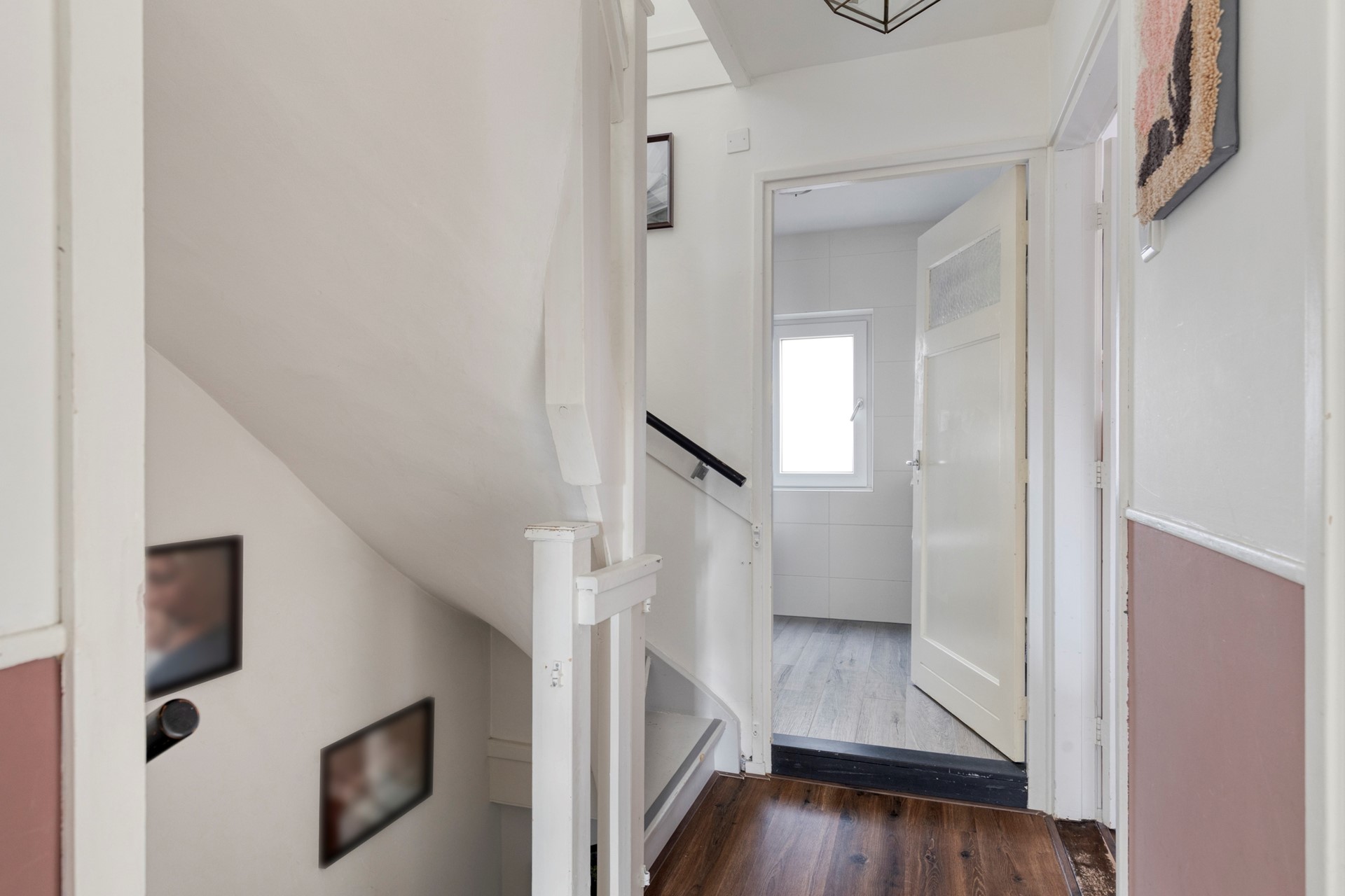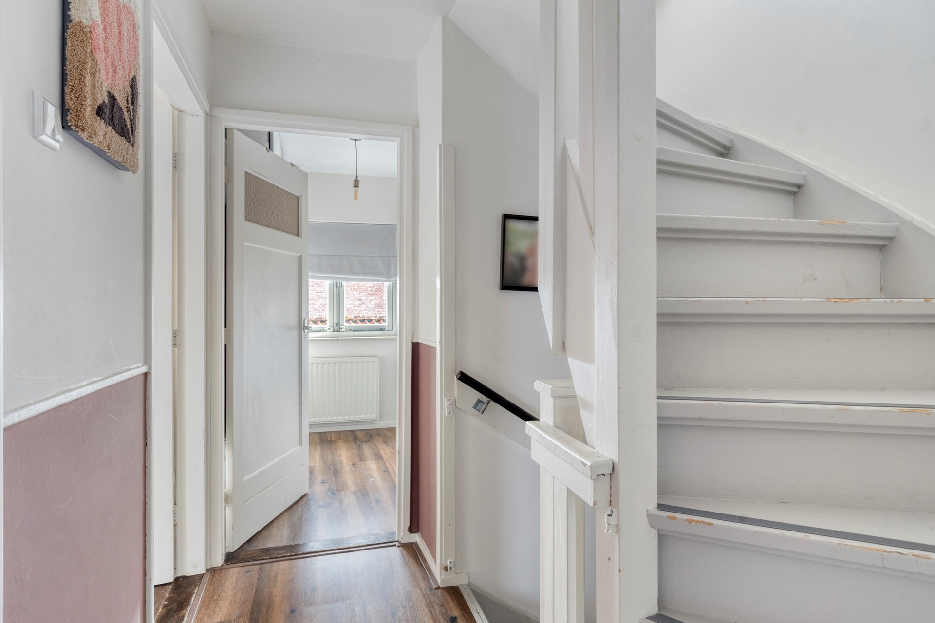 Overloop met aan de voorzijde de badkamer voorzien van douche en wastafel, deur naar royale slaapkamer aan de voorzijde met inbouwkast, twee deuren naar de slaapkamers aan de achterzijde waarvan een toegang heeft tot het balkon. Trap naar bovengelegen verdieping.