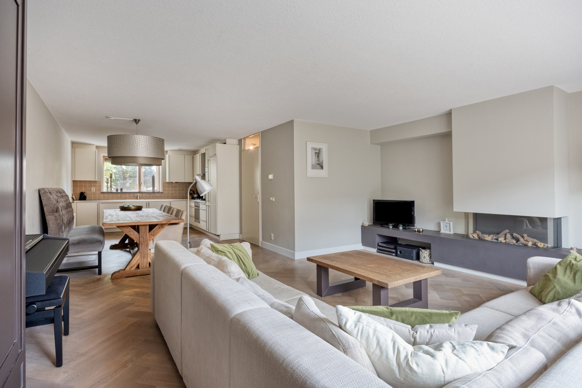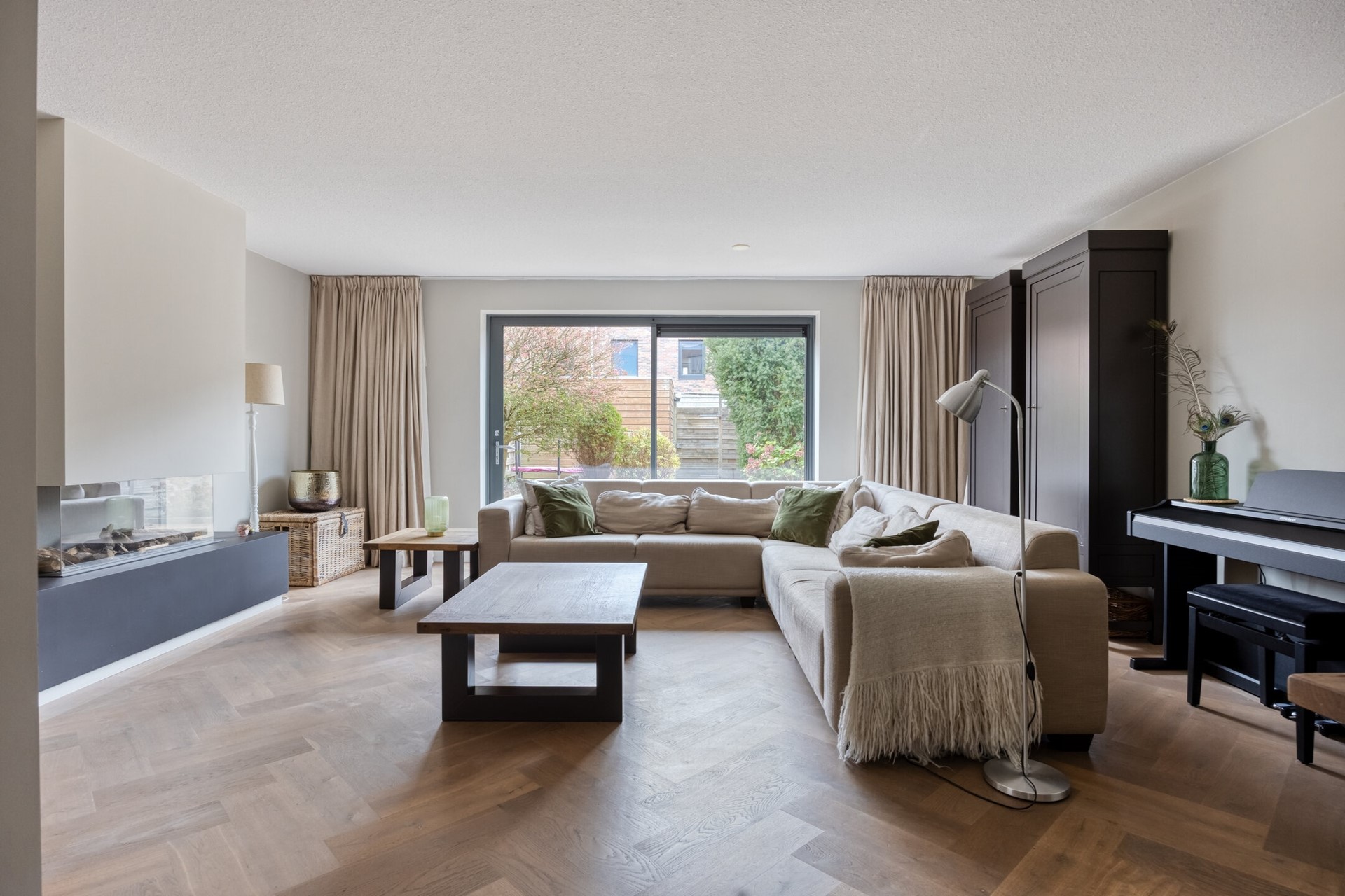 Zodra je door de voordeur stapt, voel je het al: dit is een huis waar het leven zich moeiteloos laat leven. De stijlvolle visgraat parketvloer op de begane grond geeft direct een warme, moderne sfeer. Je kijkt uit over de royale woonkamer, waar een open haard uitnodigt op winteravonden en de zon via de grote schuifpui naar binnen stroomt. Hier maak je moeiteloos contact met de achtertuin met berging en achterom, waardoor binnen en buiten bijna in elkaar over lijken te lopen.