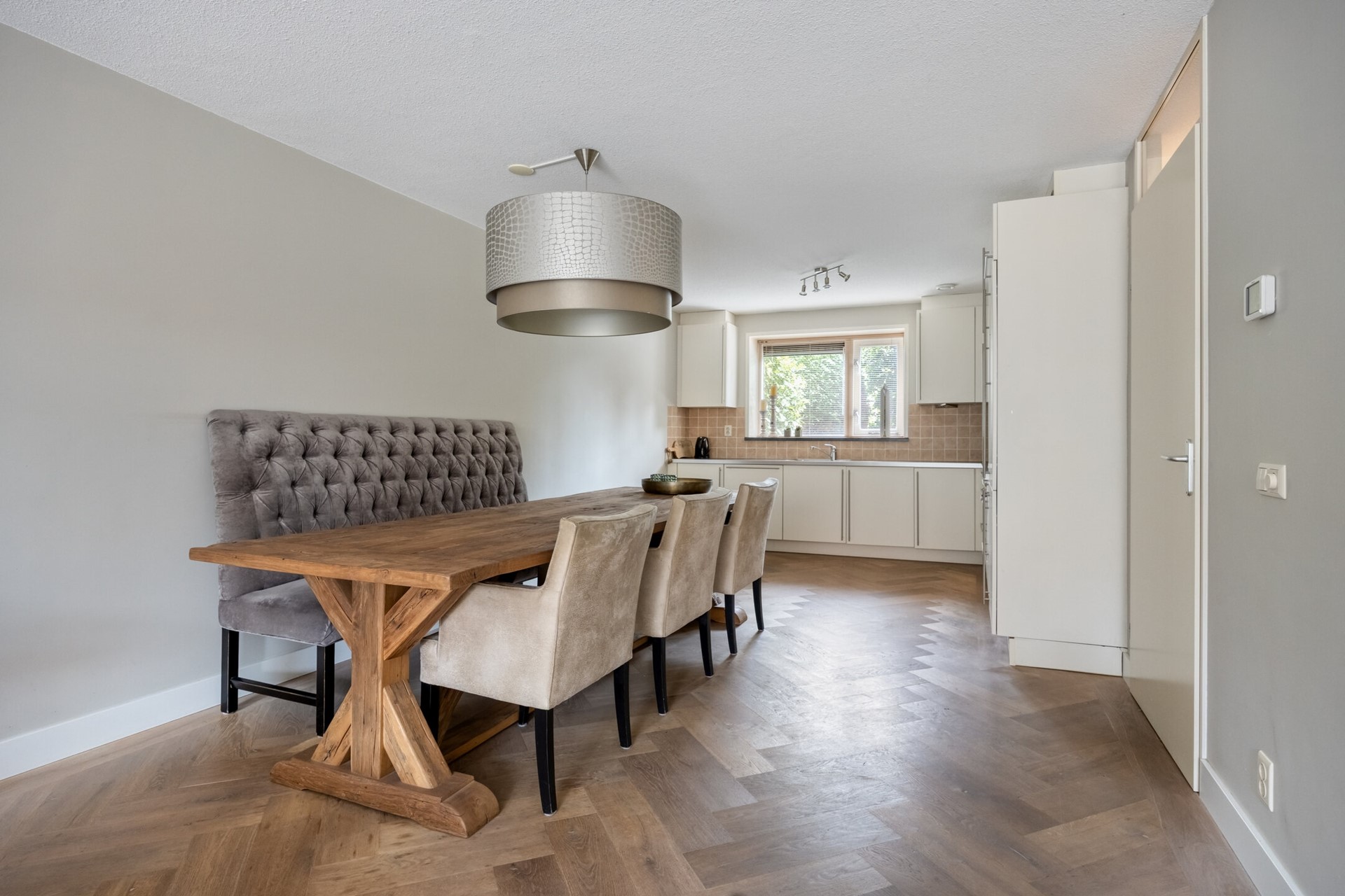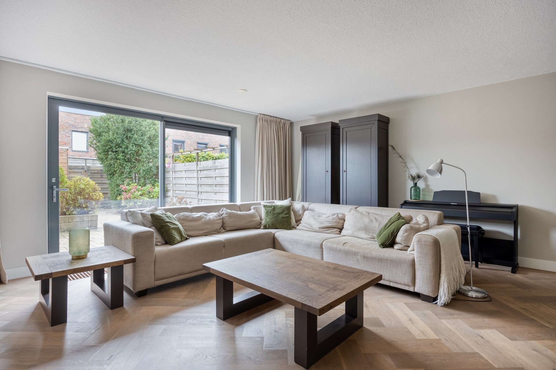 De woonkamer ademt ruimte – of je nu graag gasten uitnodigt voor een etentje, kinderen hun gang laat gaan met knutselspullen, of zelf na een lange werkdag op de bank ploft. De schuifpui én de lichtinval maken deze plek tot het warme hart van het huis. Zet die schuifpui wijd open en laat een zwoele zomeravond zo de woonkamer in glijden!