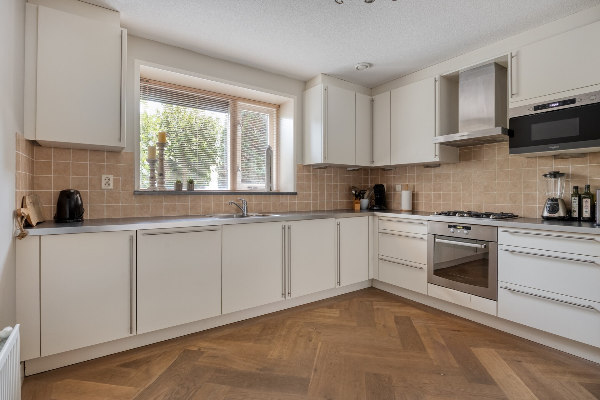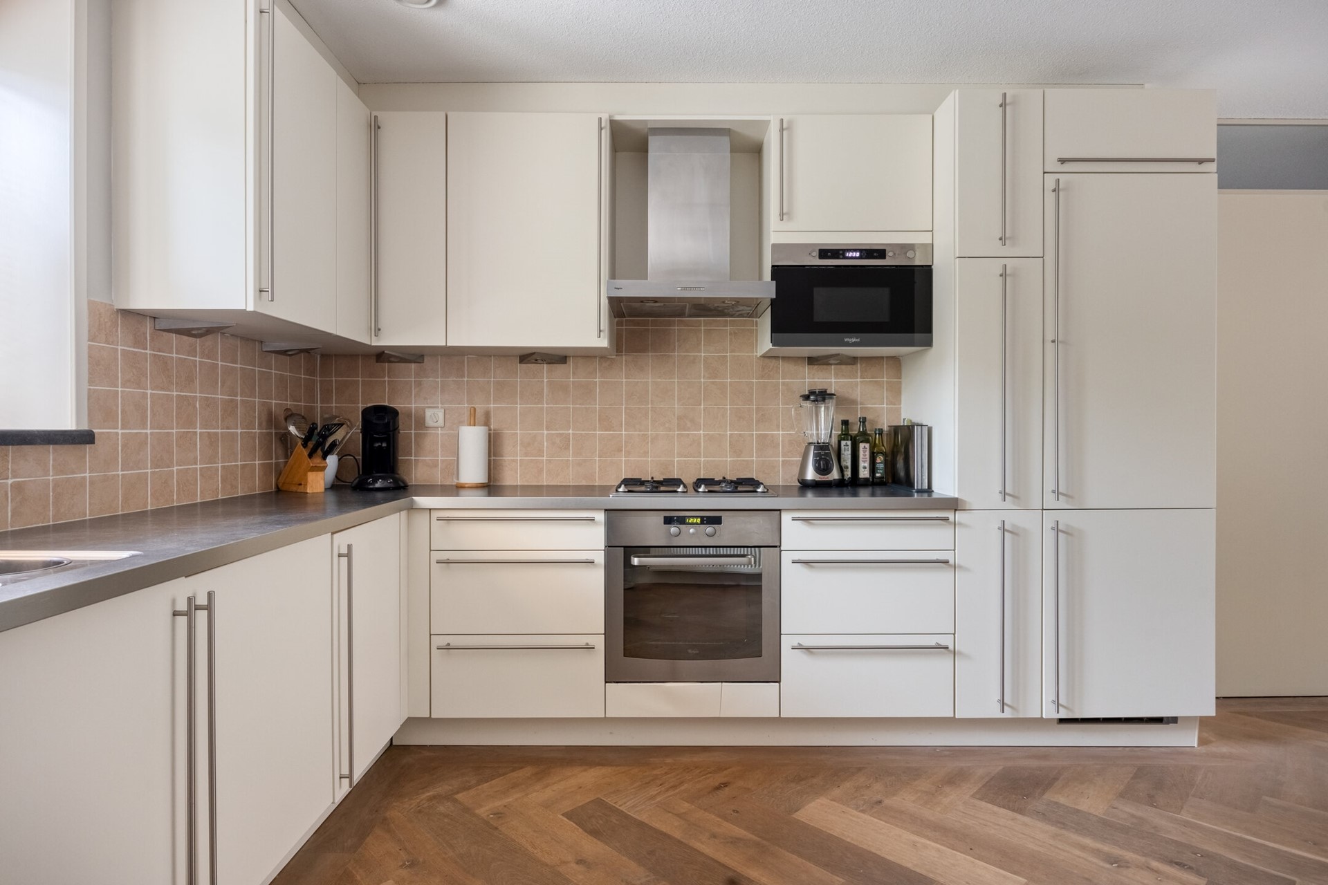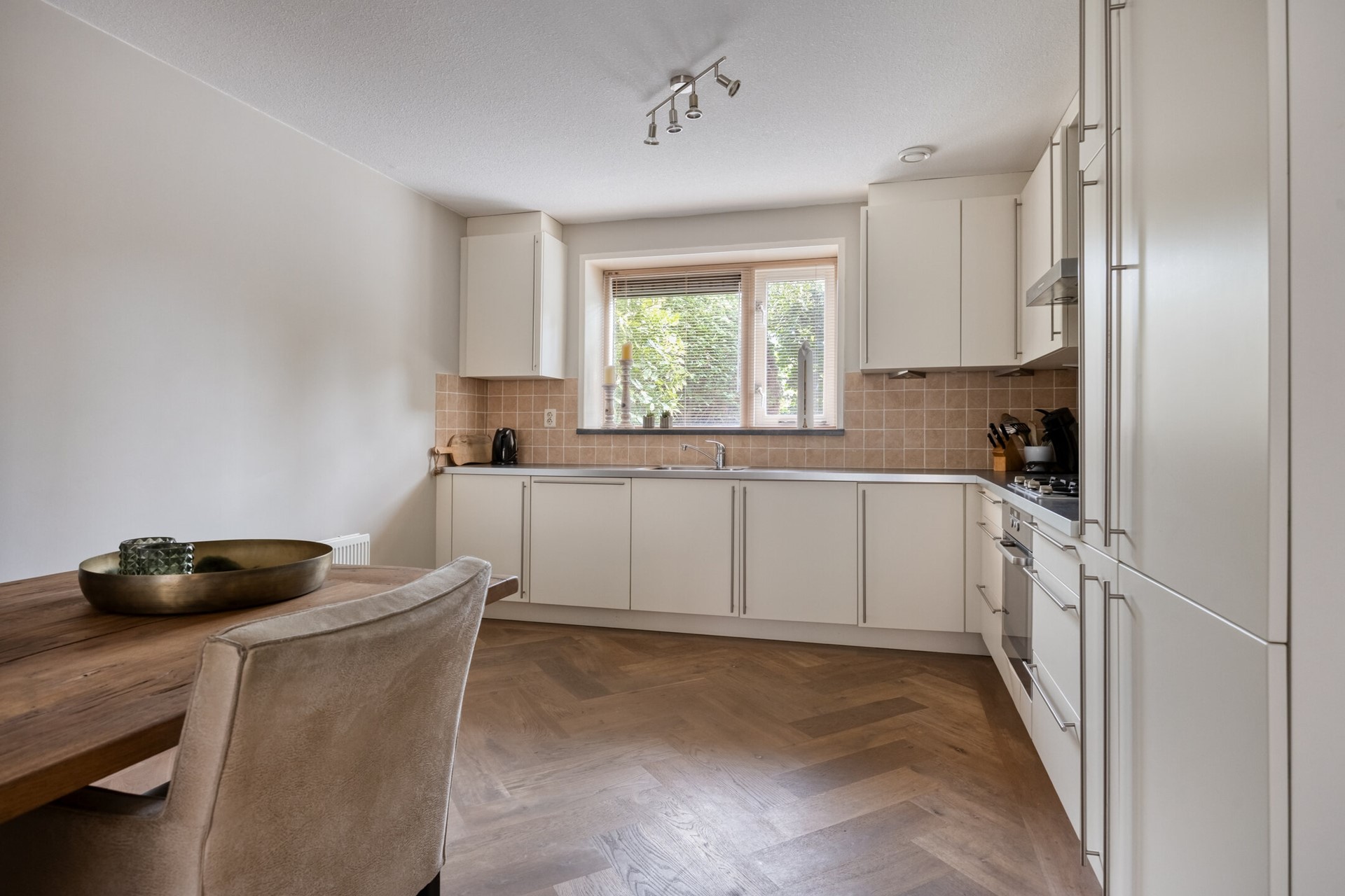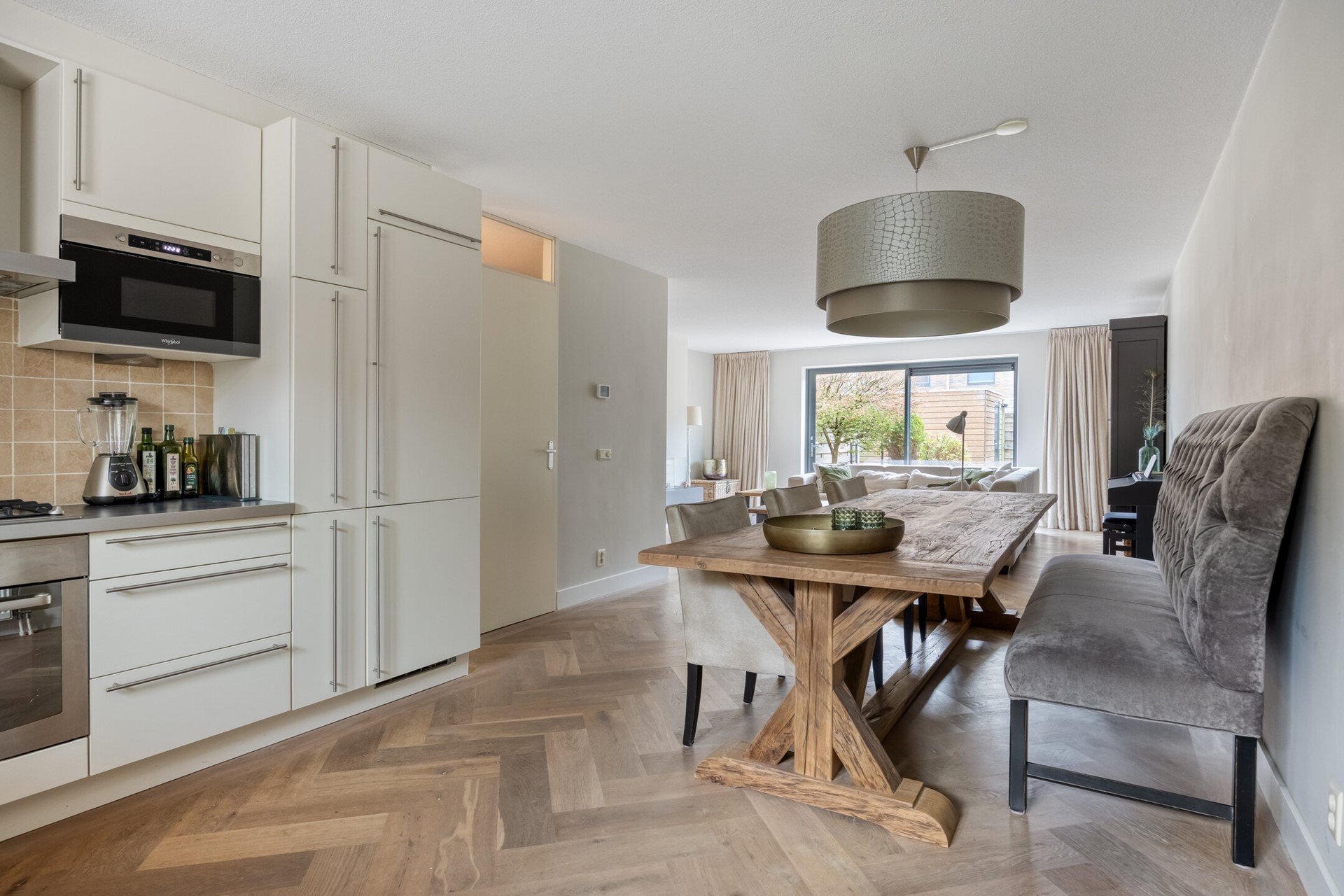 Grenzend aan de woonkamer vind je de goed uitgeruste keuken waar je van ieder ontbijt tot een feestje maakt. Er is genoeg plek om samen te kokkerellen, uitgebreid te bakken of gewoon lekker te borrelen met vrienden aan het aanrecht. En ben je klaar, dan wandel je zo met je bord de achtertuin in – dát is pas genieten met mooi weer.