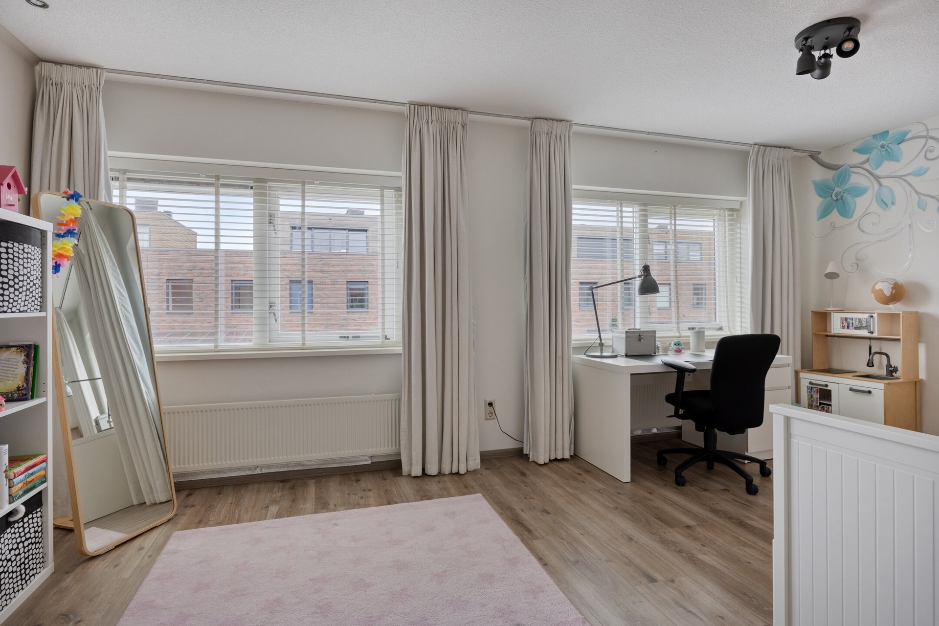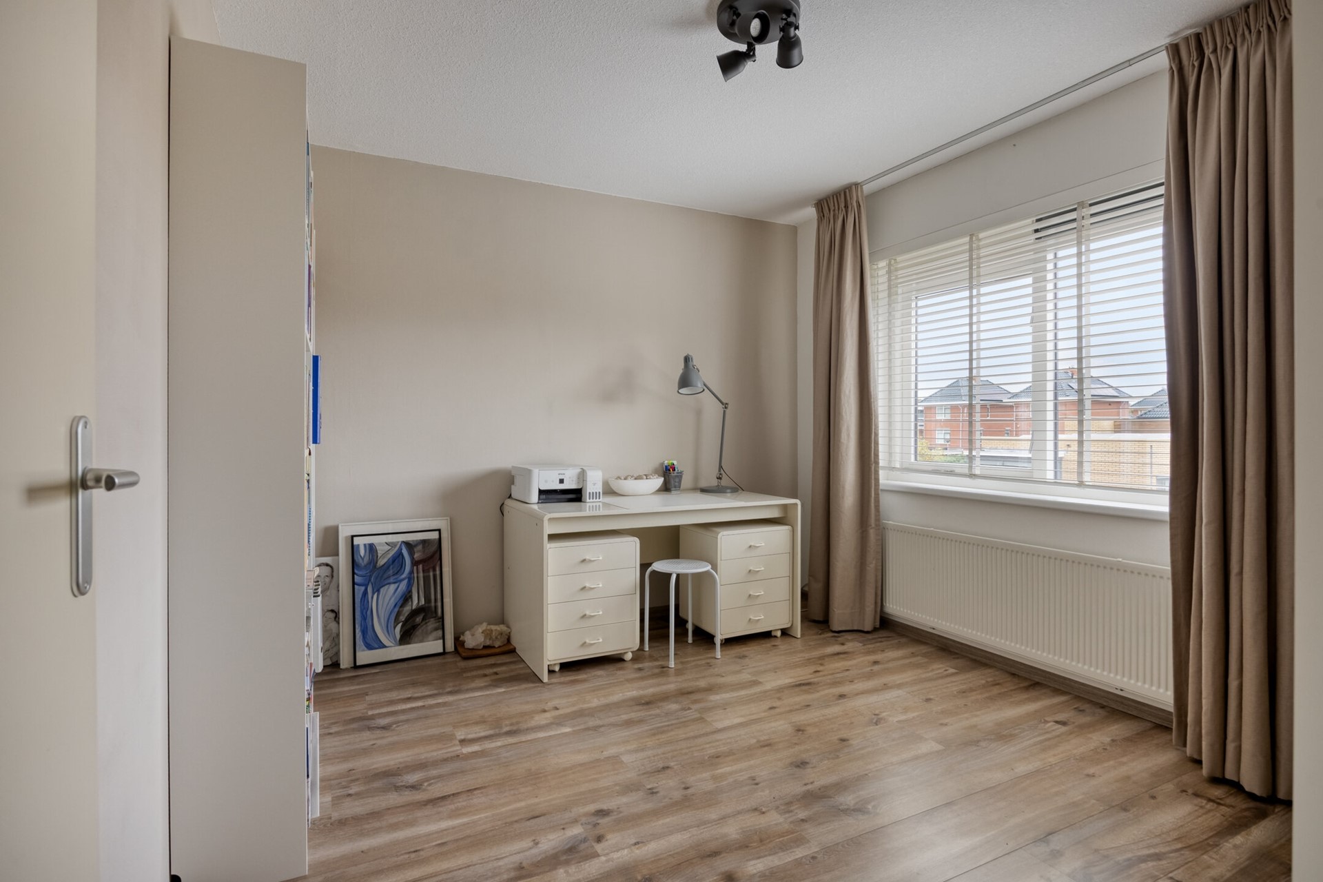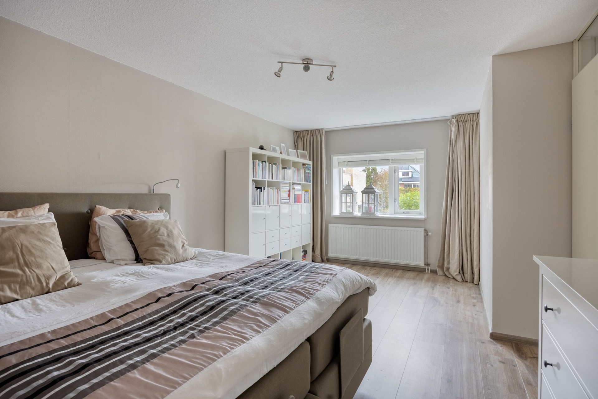 Deze woning biedt maar liefst vijf ruime slaapkamers, verdeeld over twee verdiepingen. Kiezen wordt lastig: maak je van eentje een riante thuiswerkplek, wordt de zolder het domein voor pubers, of droom je van een luxe walk- in closet? Alles kan. Iedereen krijgt z’n eigen plek en opbergruimte is er meer dan genoeg.
