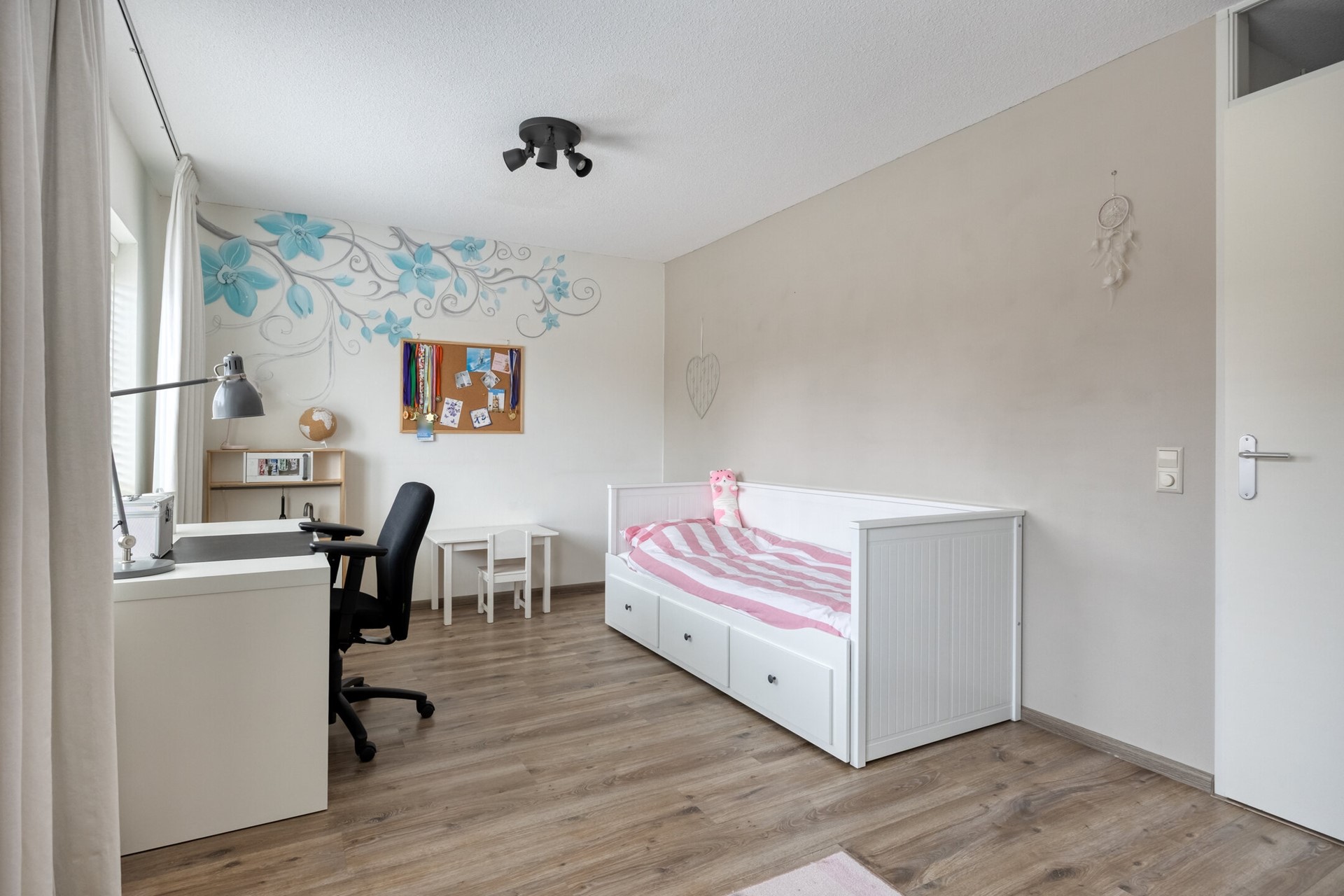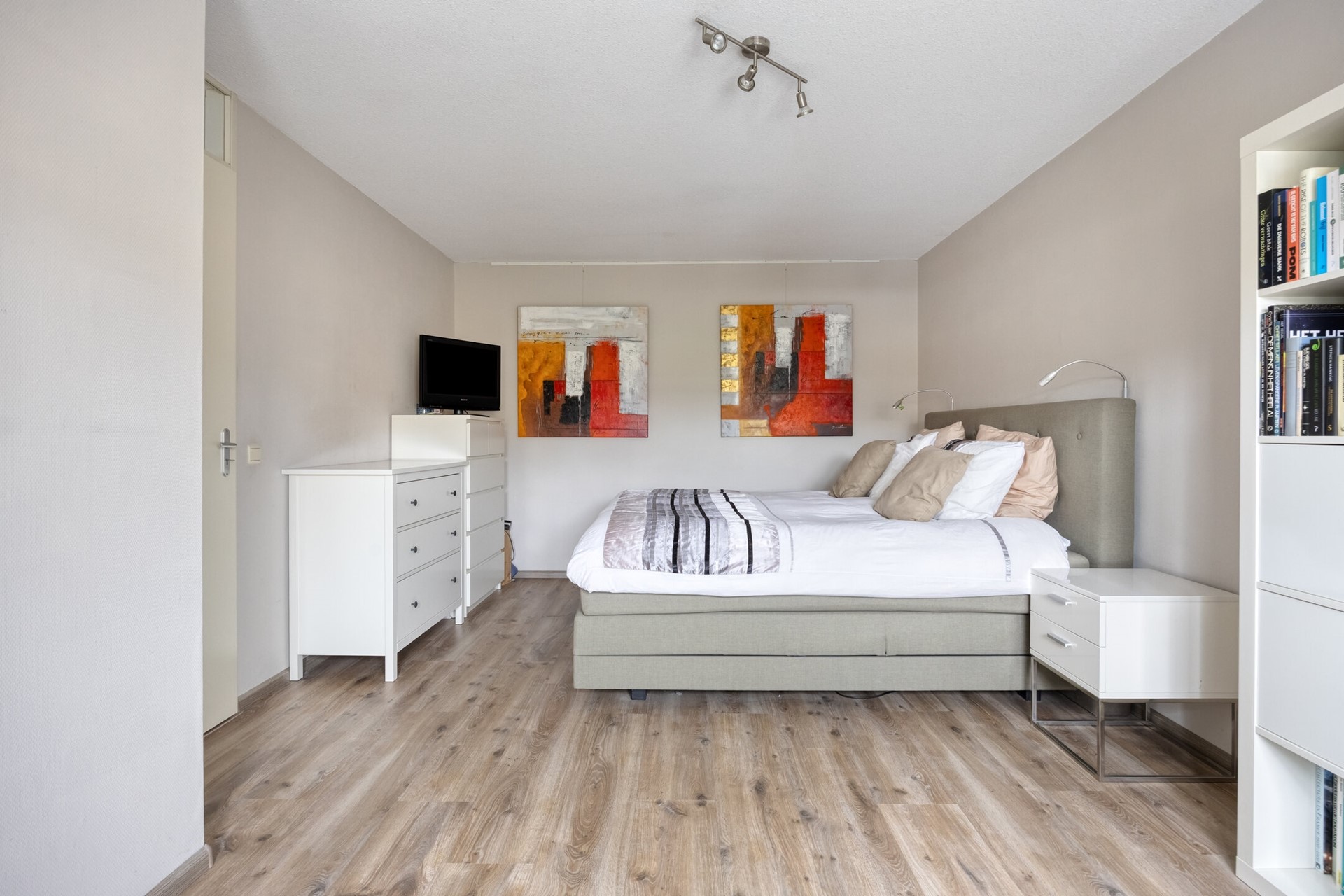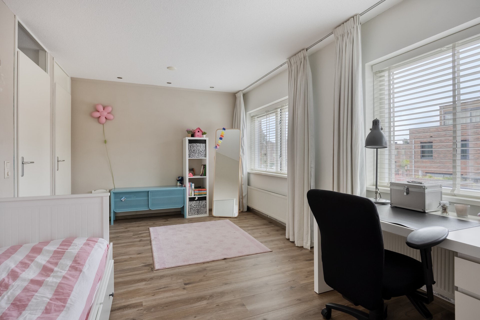 Deze woning biedt maar liefst vijf ruime slaapkamers, verdeeld over twee verdiepingen. Kiezen wordt lastig: maak je van eentje een riante thuiswerkplek, wordt de zolder het domein voor pubers, of droom je van een luxe walk- in closet? Alles kan. Iedereen krijgt z’n eigen plek en opbergruimte is er meer dan genoeg.