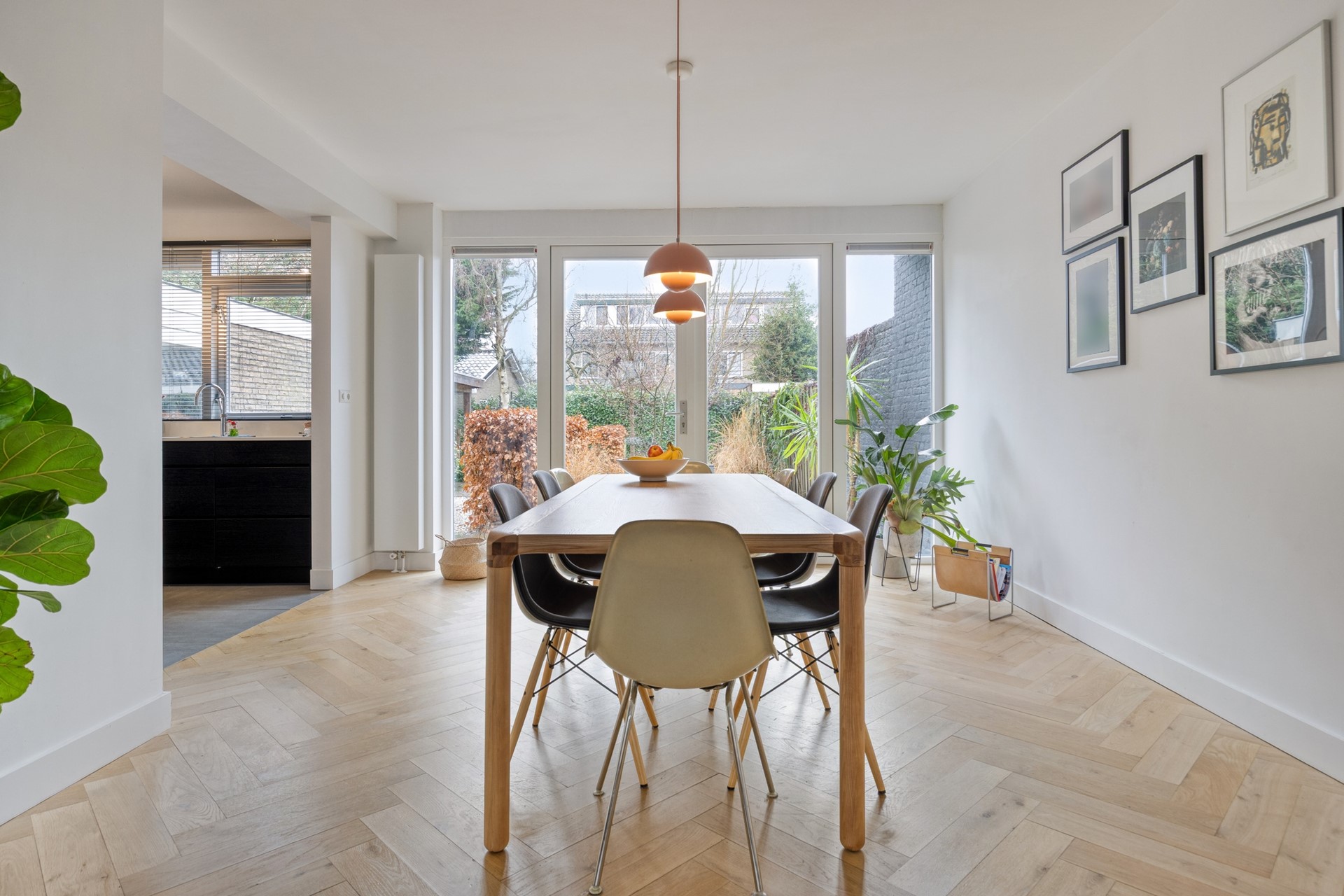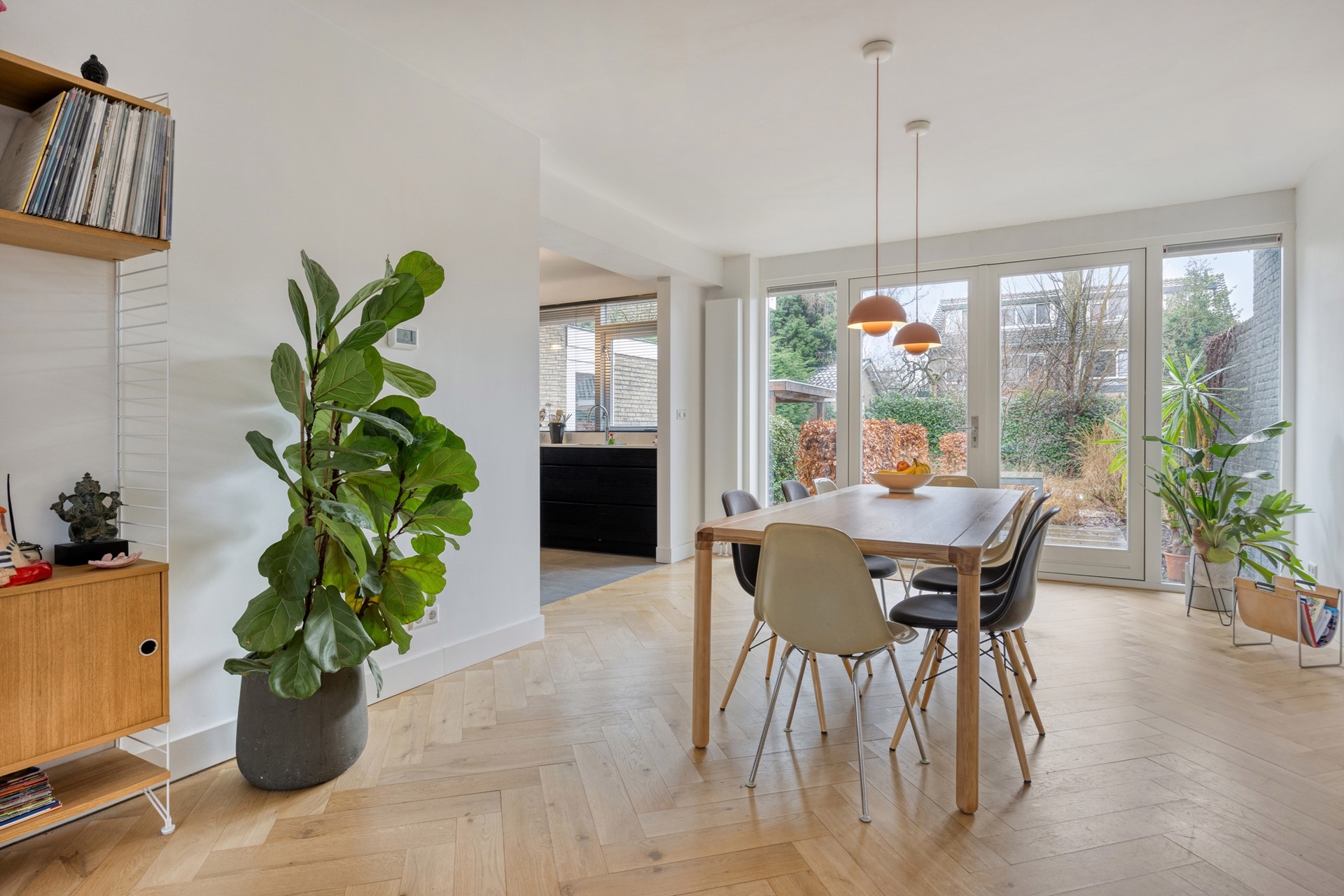 L-vormige woonkamer met eikenhouten vloer en openhaard, met een aan de tuinzijde gelegen ruime open keuken in u- vormige opstelling en voorzien van inbouwapparatuur (oven, magnetron, inductiekookplaat, koel/vriescombinatie, afzuigkap, quooker, vaatwasser)..