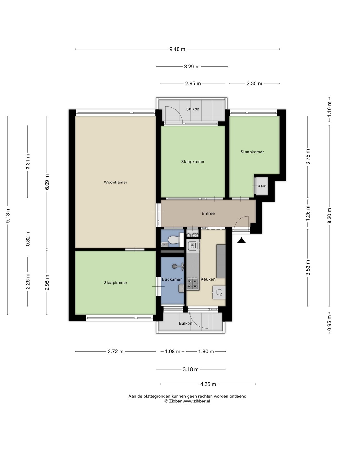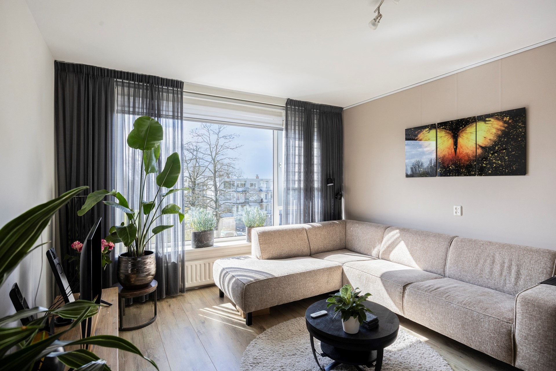 kleine voorkamer, grote voorkamer met deur naar het zonnige balkon (ZW) met schuin het uitzicht naar de vliet en aan de voorzijde zicht op groen.
