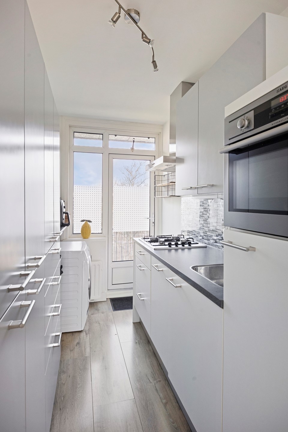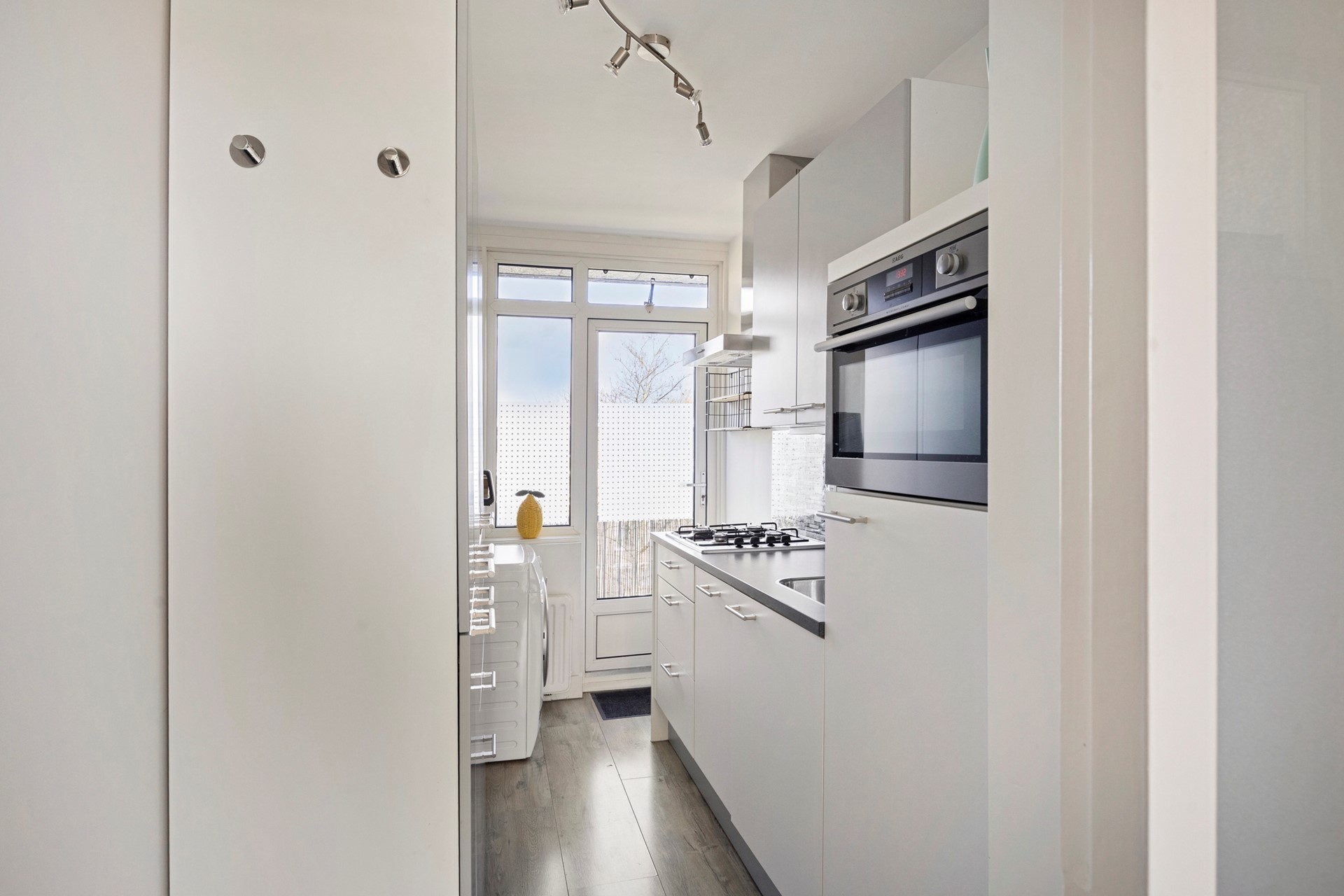 Voordeur, ruime gang met de meterkast, toilet met fonteintje, dichte keuken met modern keukenblok, voorzien van inbouw apparatuur o.a. koelkast, magnetron, vaatwasser, kookplaat en afzuigkap, via de keuken deur naar het achterbalkon.