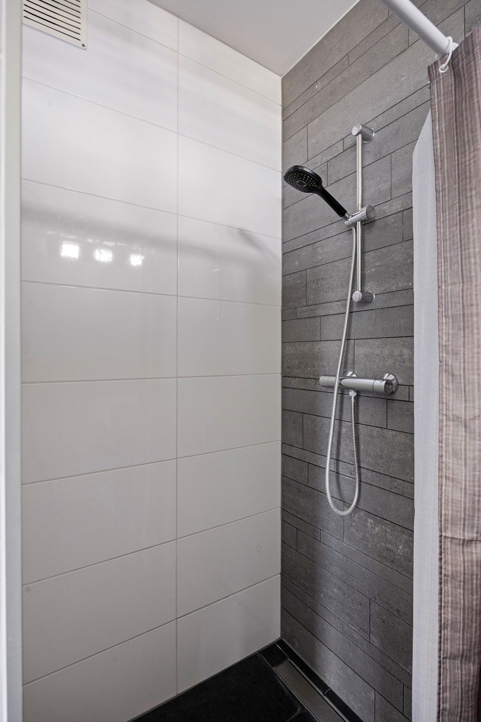 Gezellige lichte woonkamer met vrij uitzicht, ruime slaapkamer met de toegang tot de moderne badkamer met douche voorzien van glazen scherm, wastafel met meubel en een raampje.